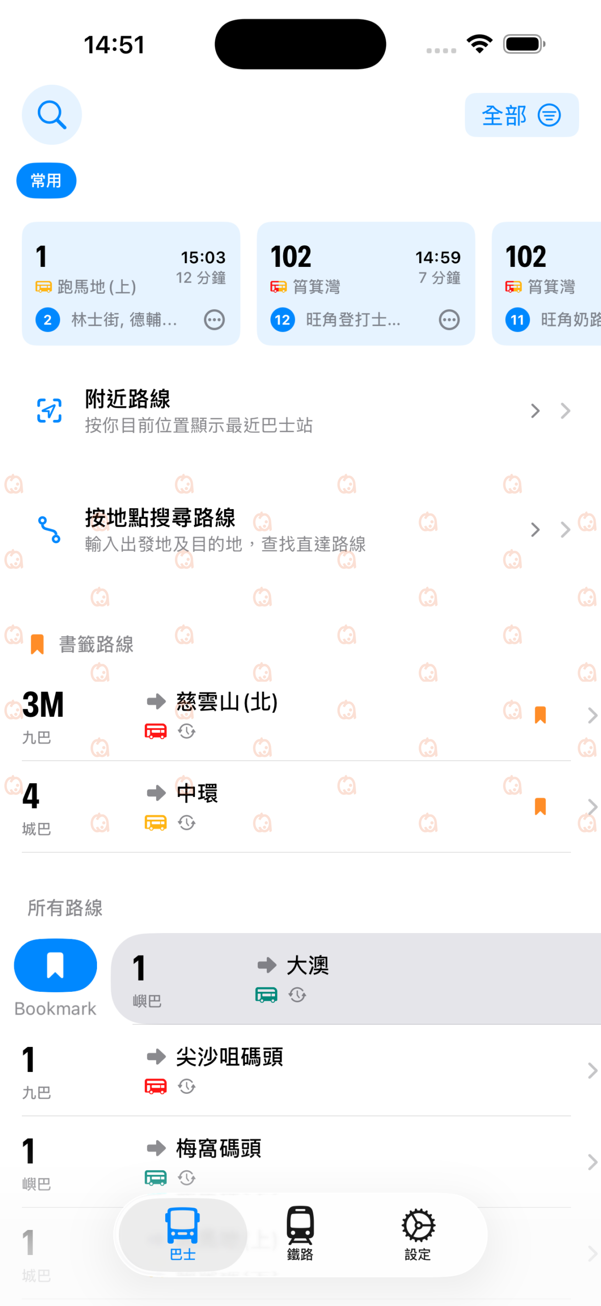 書籤路線: 「書籤路線」入面列出咗你常用嘅路線。你可以向右滑動來添加書籤或取消書籤。