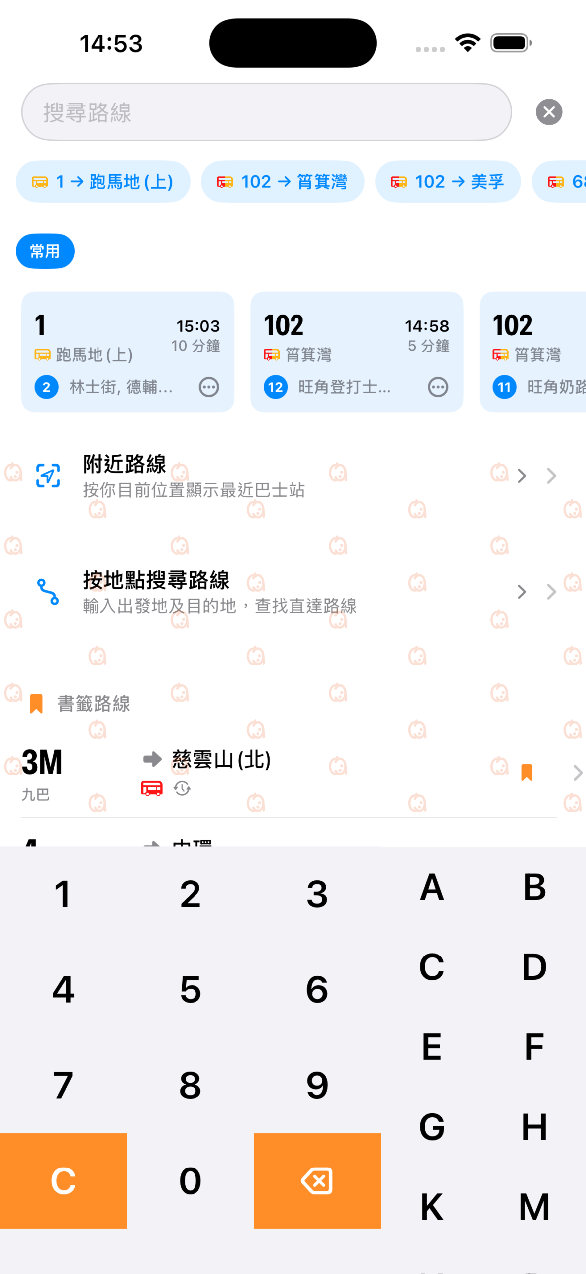 搜尋功能: 左上角嘅放大鏡可以用嚟搵特定嘅巴士路線編號